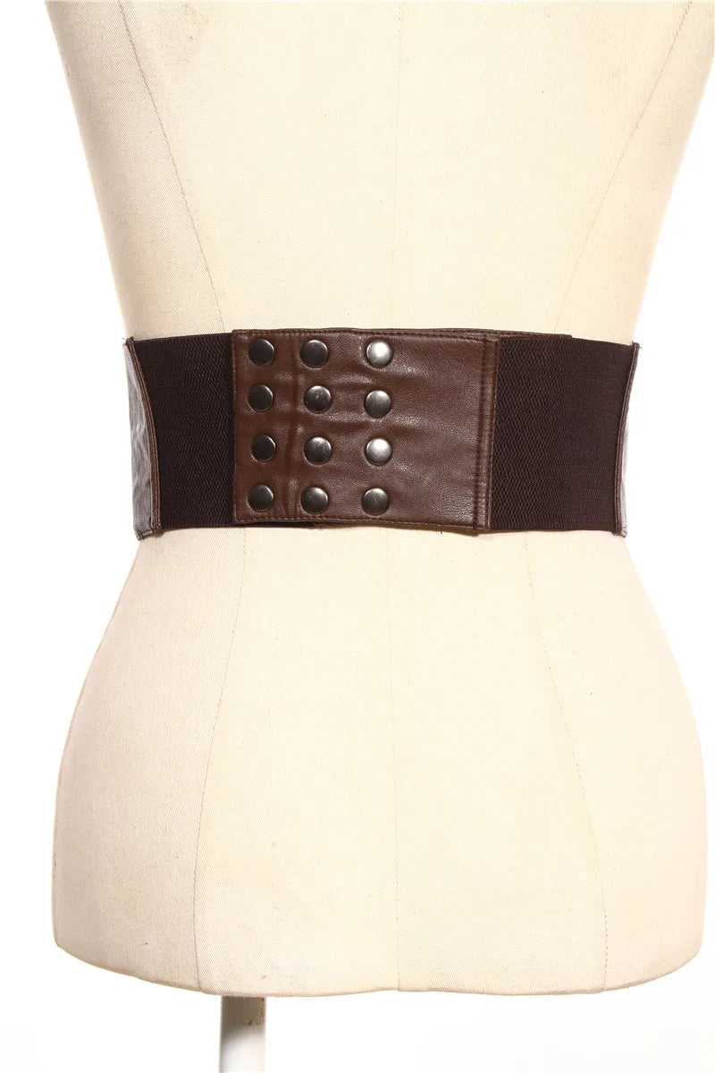 Designed as a wide corset-style belt, it emphasizes the waistline and enhances outfit structure.