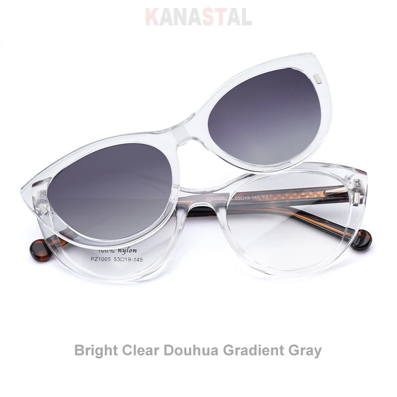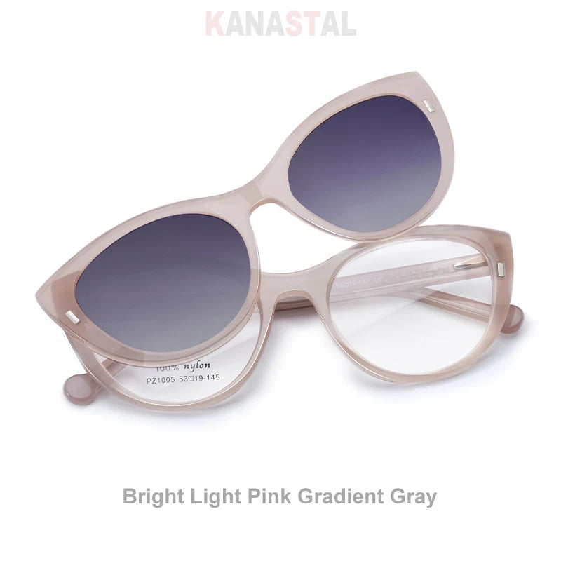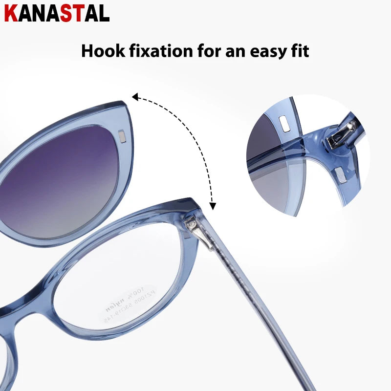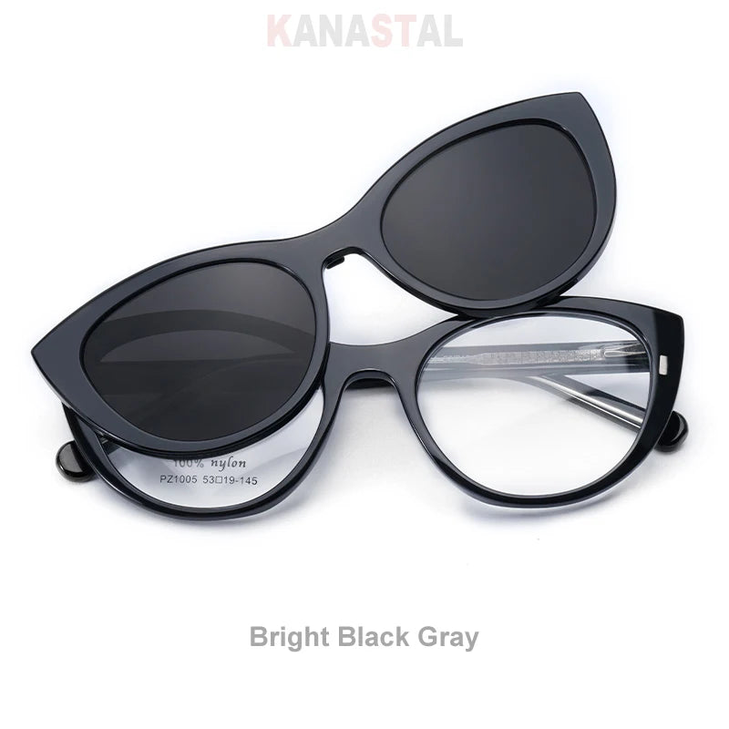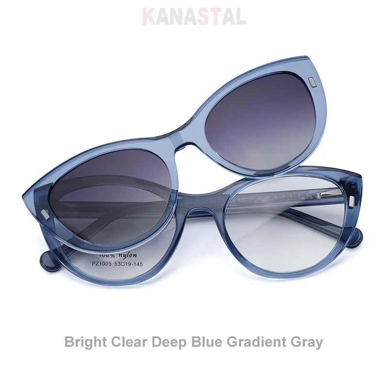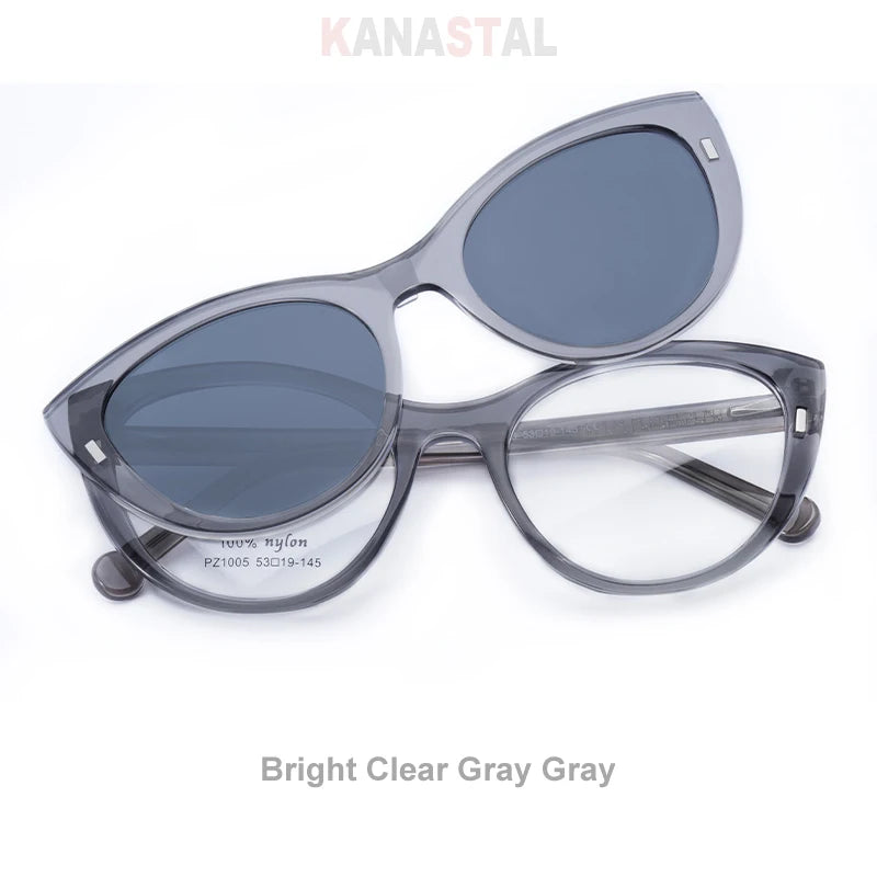 These blue light blocking prescription glasses with a magnetized sunglasses clip-on are designed for seamless transitions between screens and sunlight. Built for modern life, they combine digital eye protection, prescription-ready clarity, and snap-on sun coverage — all wrapped in a flattering cat-eye silhouette.