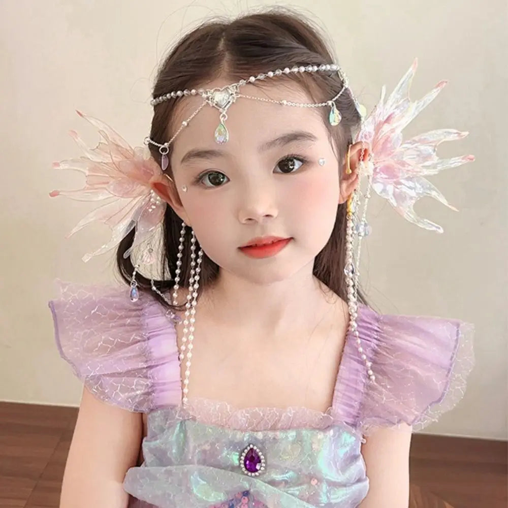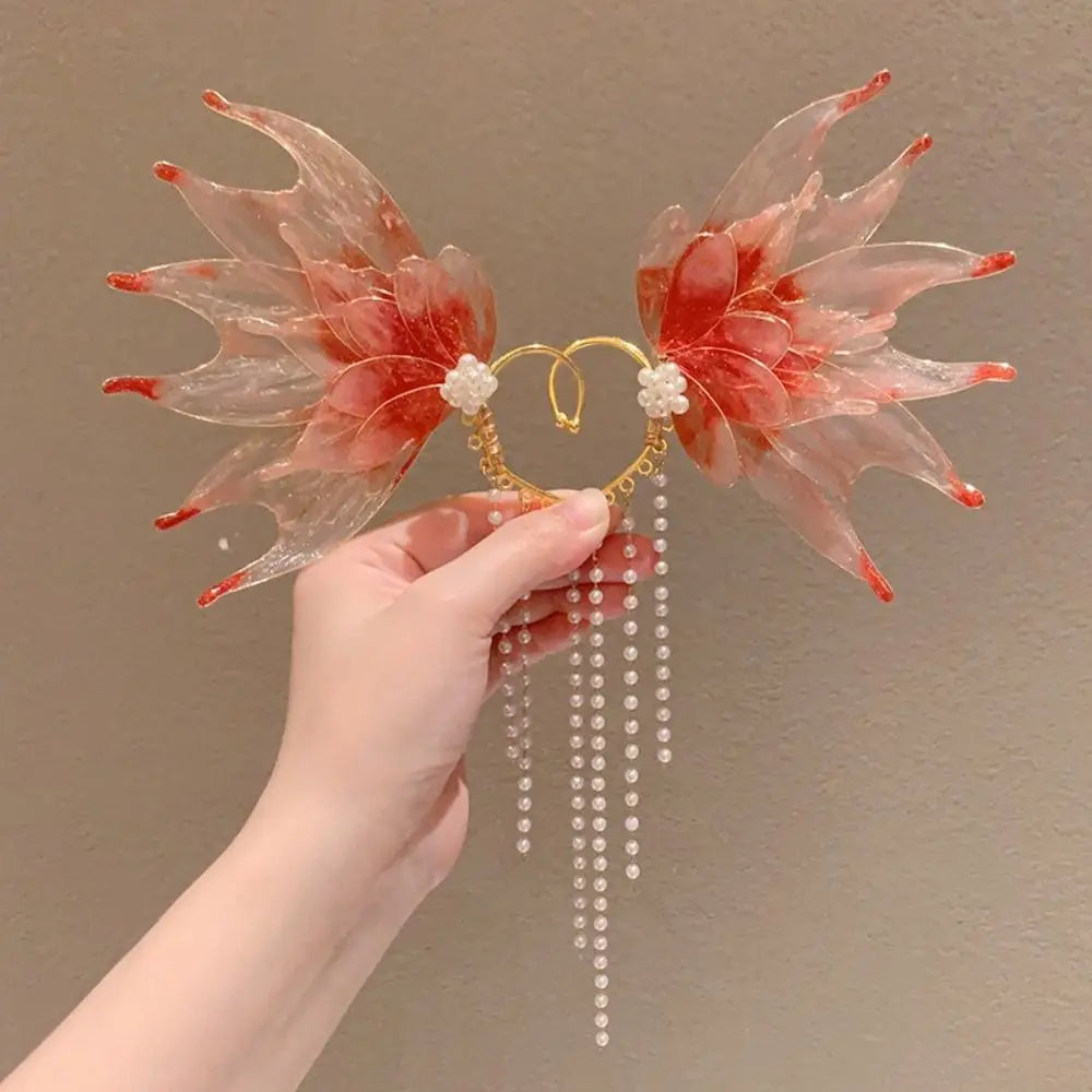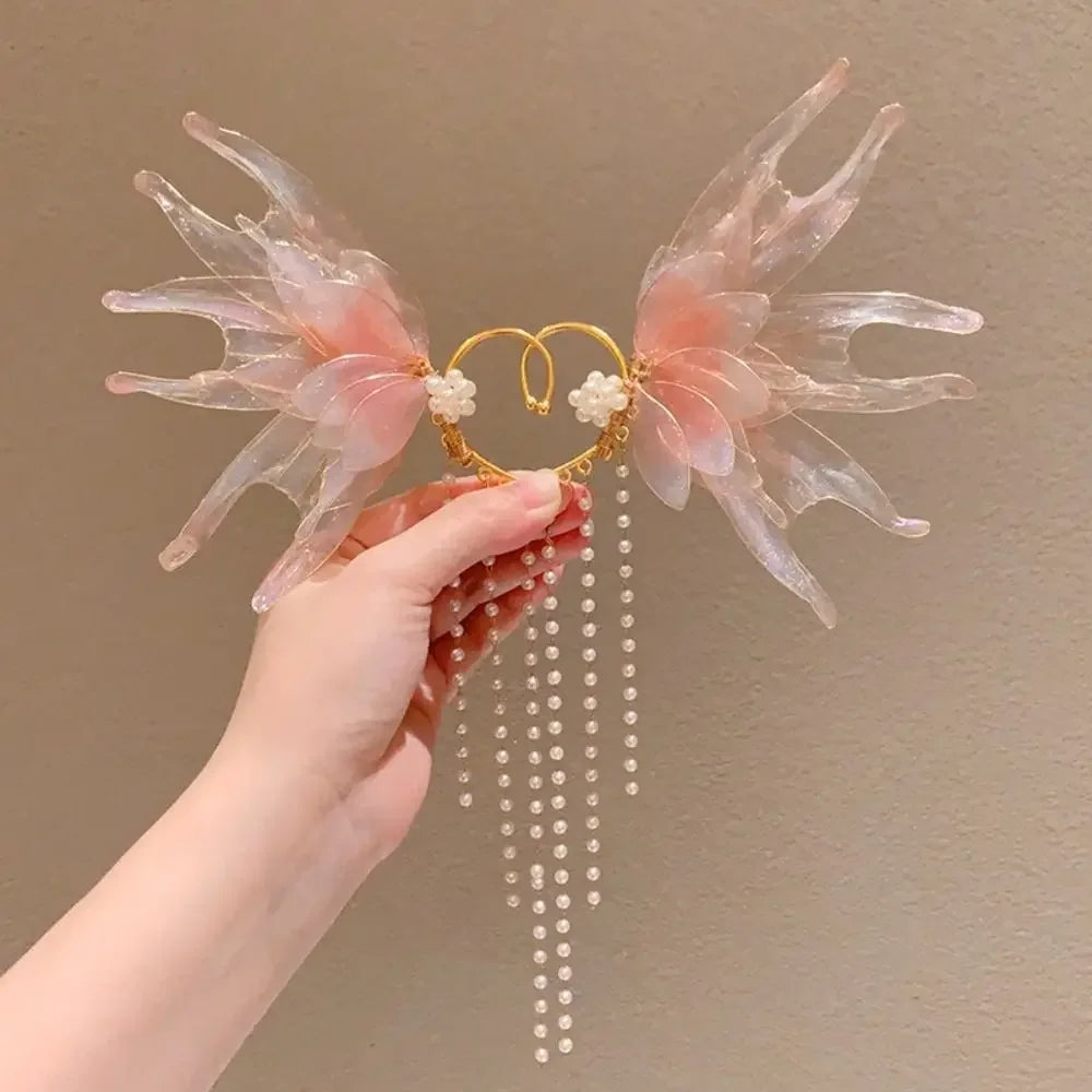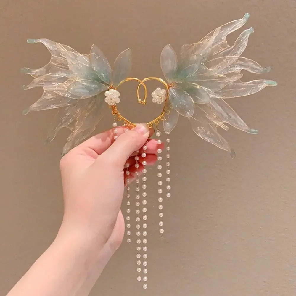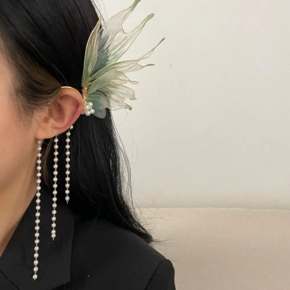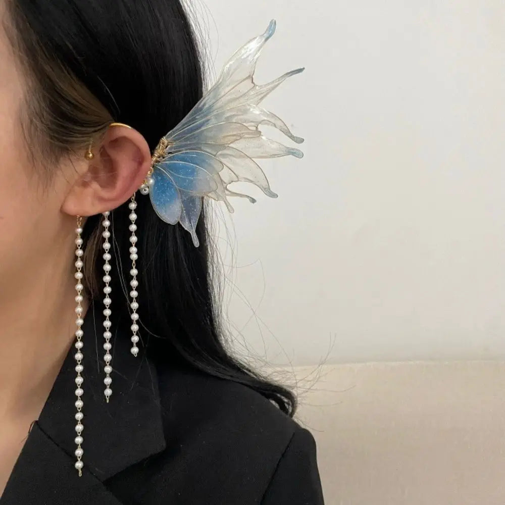 Fairy Wing Ear Accessory – Ethereal Butterfly Wing Headpiece with Pearl Chains (Multi-Color Variants)