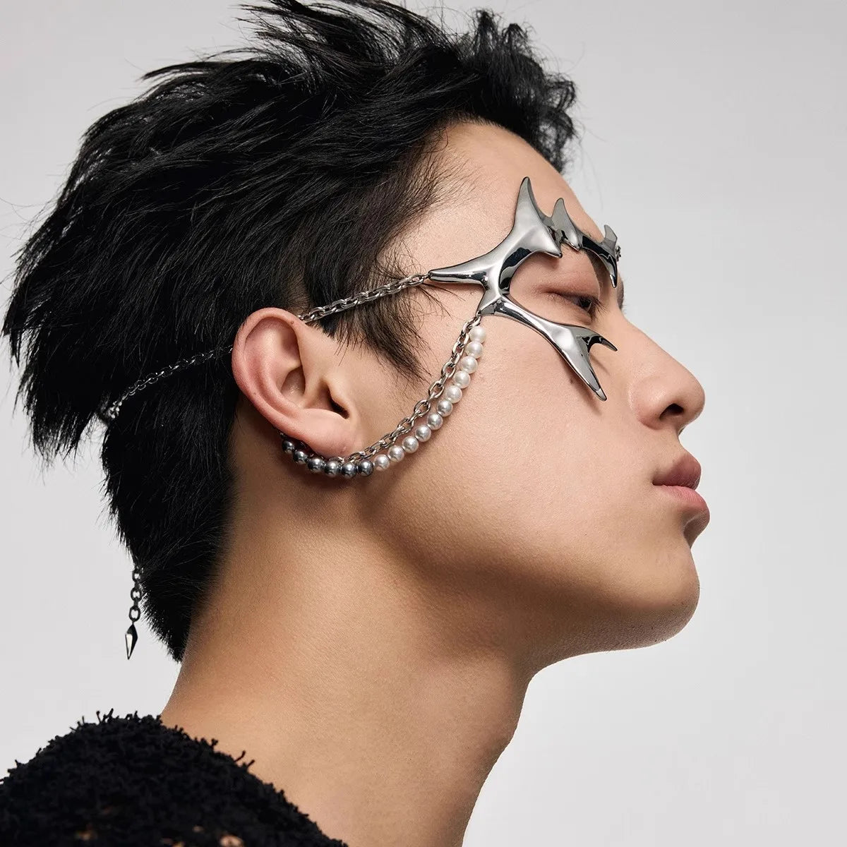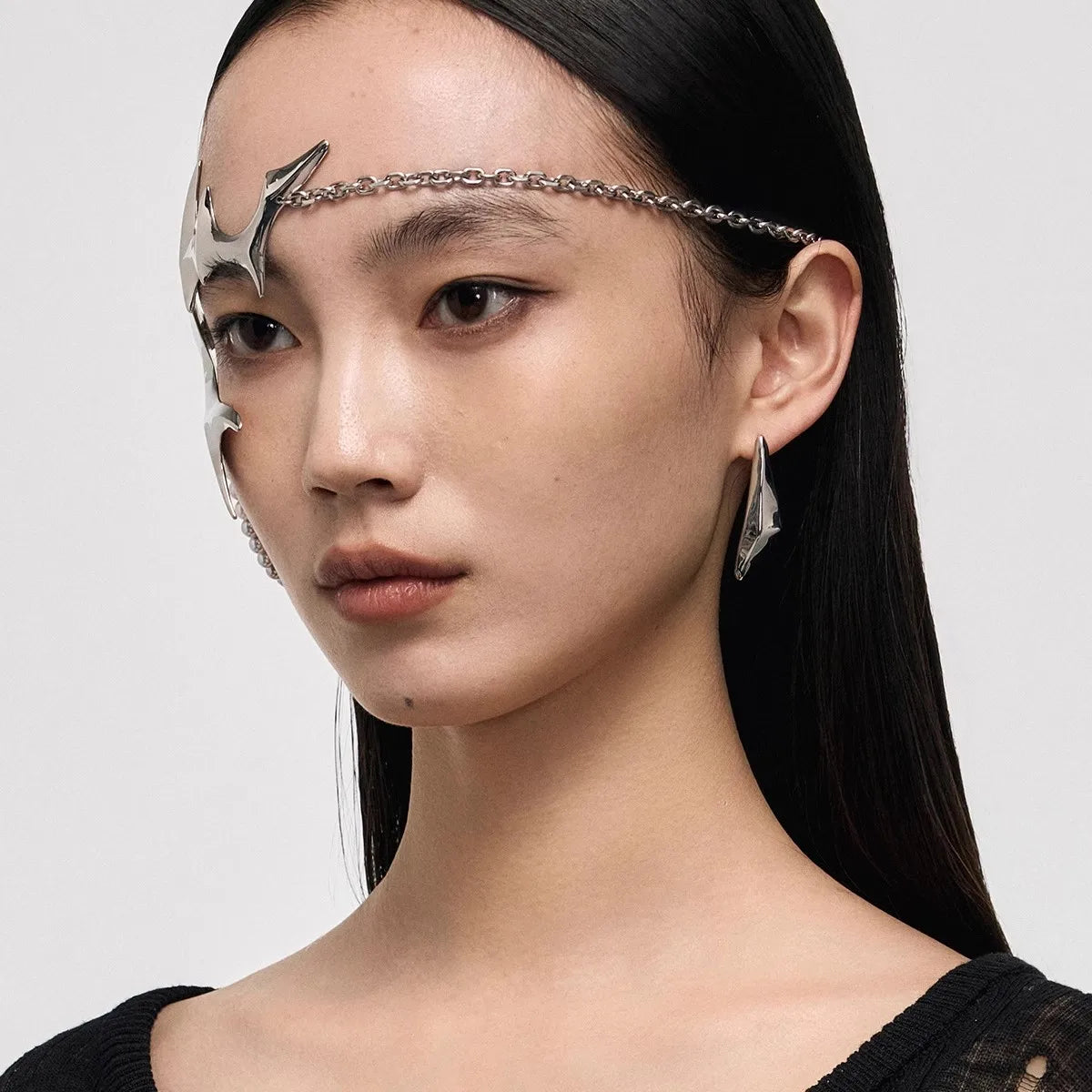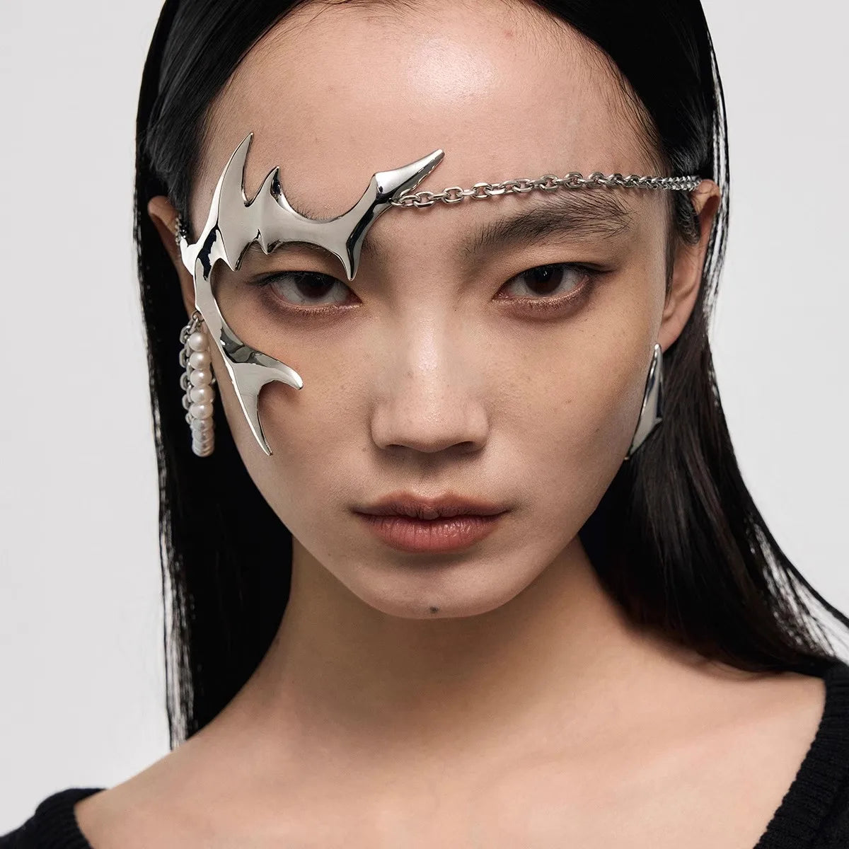 This piece is made to frame the face in a way that feels high-fashion rather than theatrical. It highlights bone structure and adds edge to minimalist outfits, making it ideal for styled looks, photoshoots, and statement fashion moments.