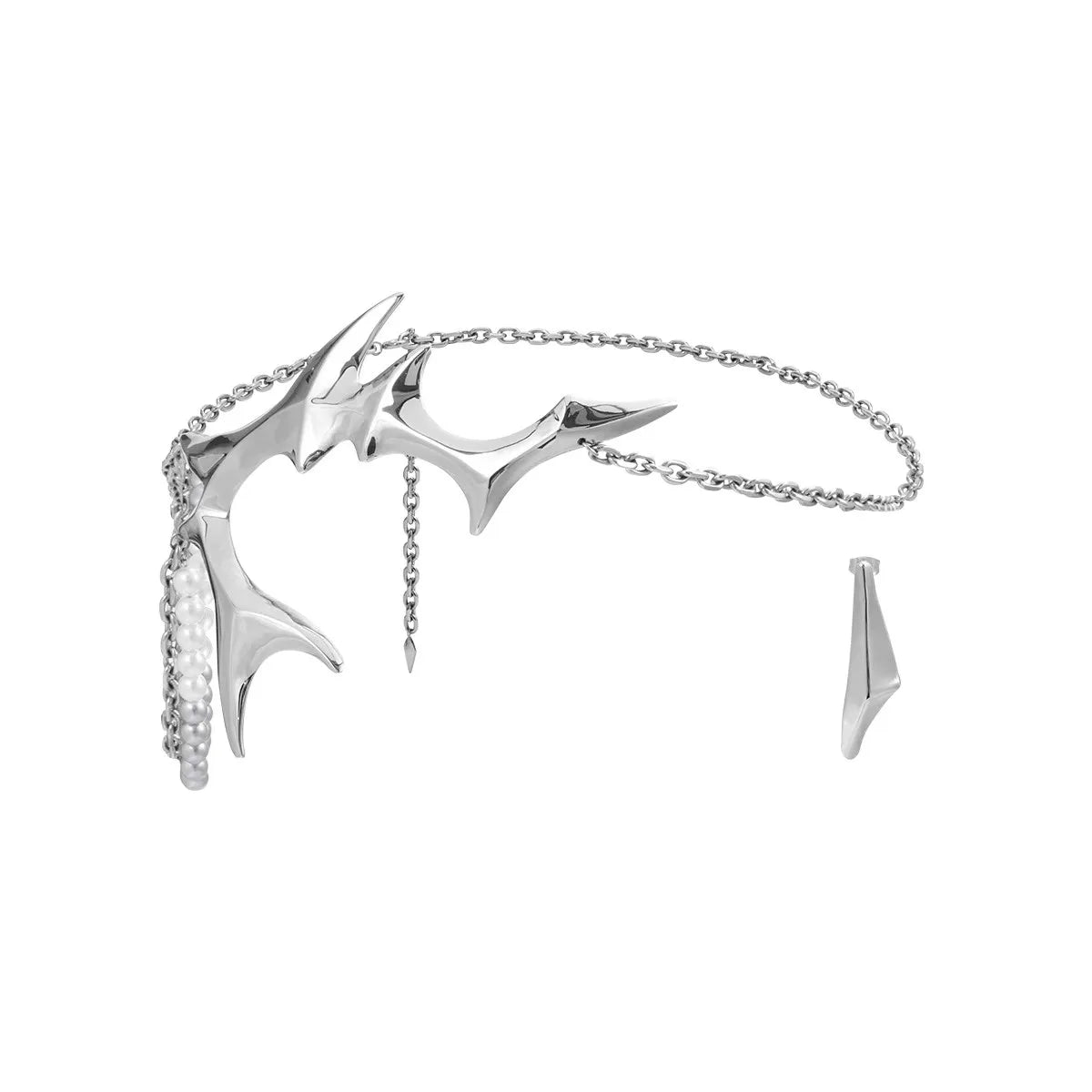 The headpiece features a structured metal thorn centerpiece paired with lightweight draped chains that contour naturally across the forehead and temple. It creates contrast between sharp form and fluid movement.