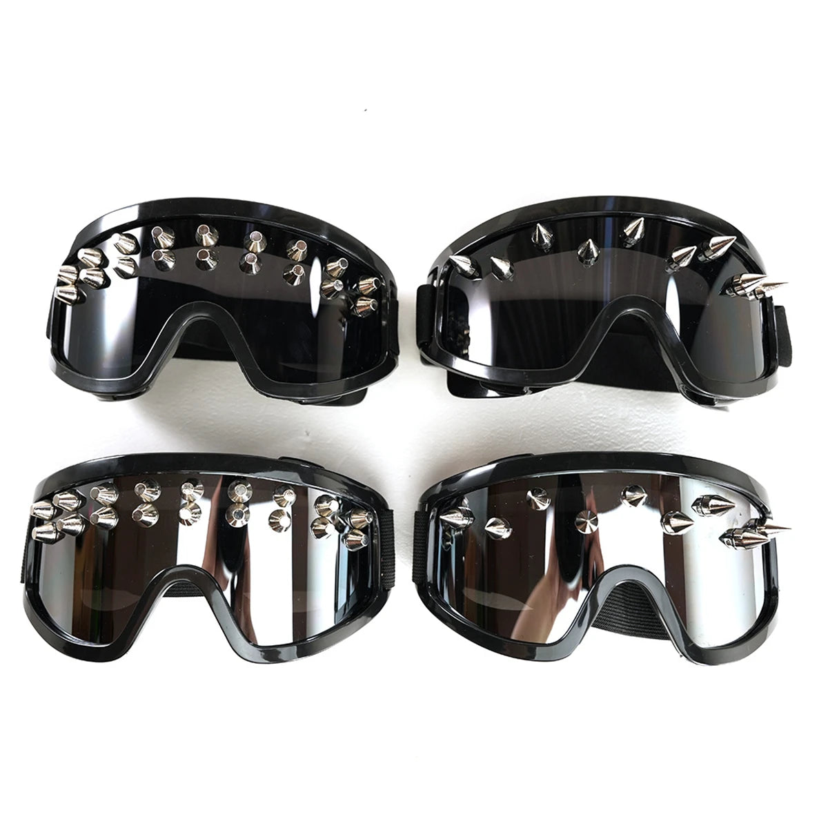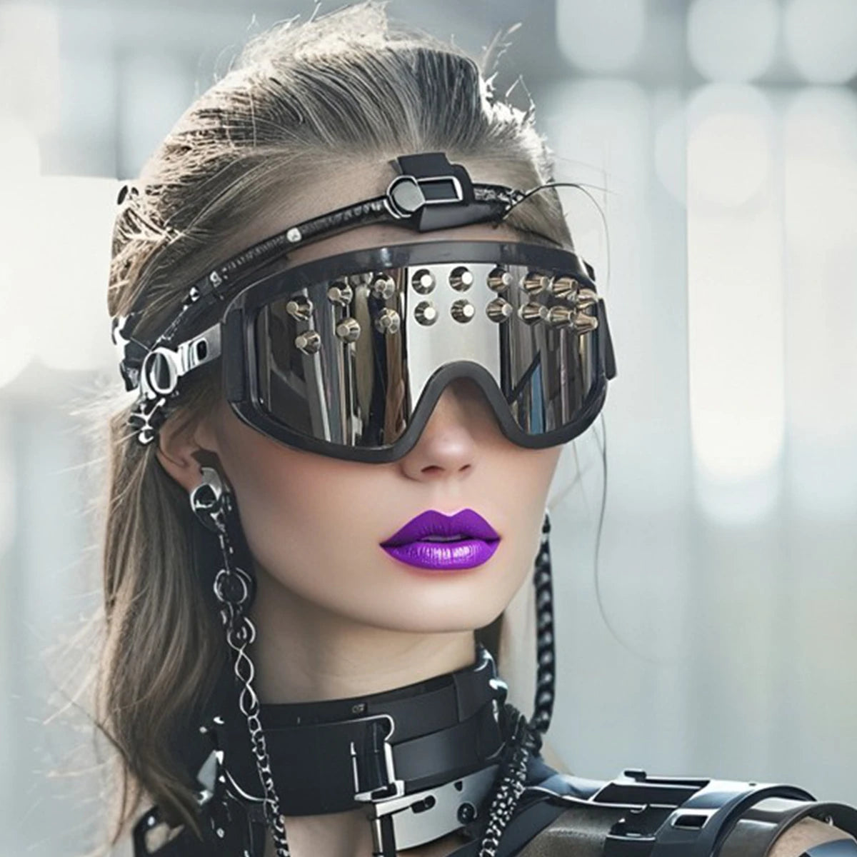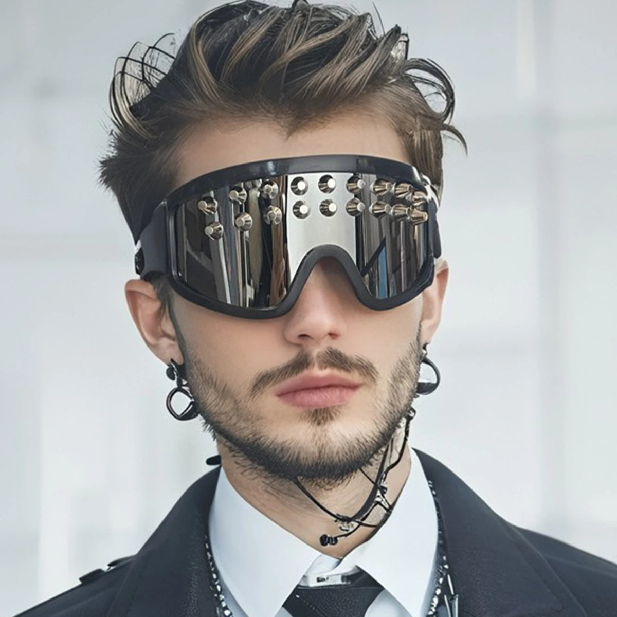 Cyber Spire Goggles – Futuristic Mirrored Cyberpunk Eyewear with Studded Metal Frame (Black & Chrome)