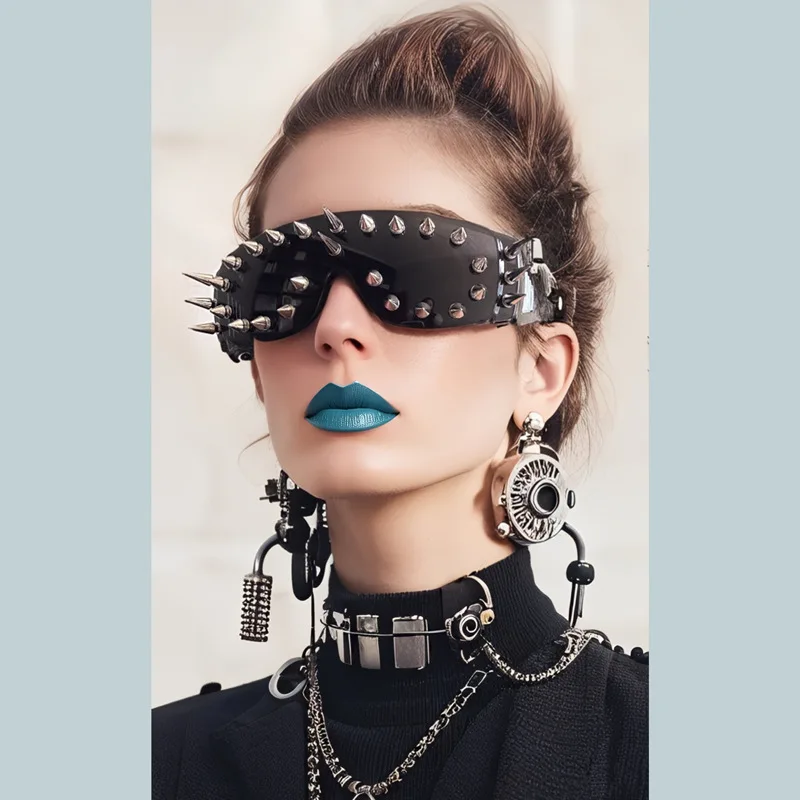 The spikes represent defense, self-expression, and rebellion, connecting the wearer to cyberpunk’s core themes of resistance and empowerment.