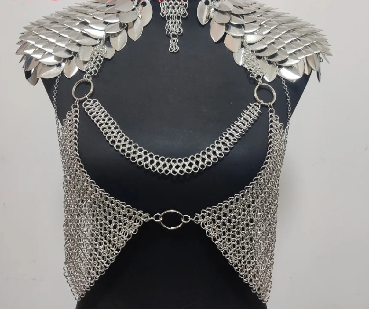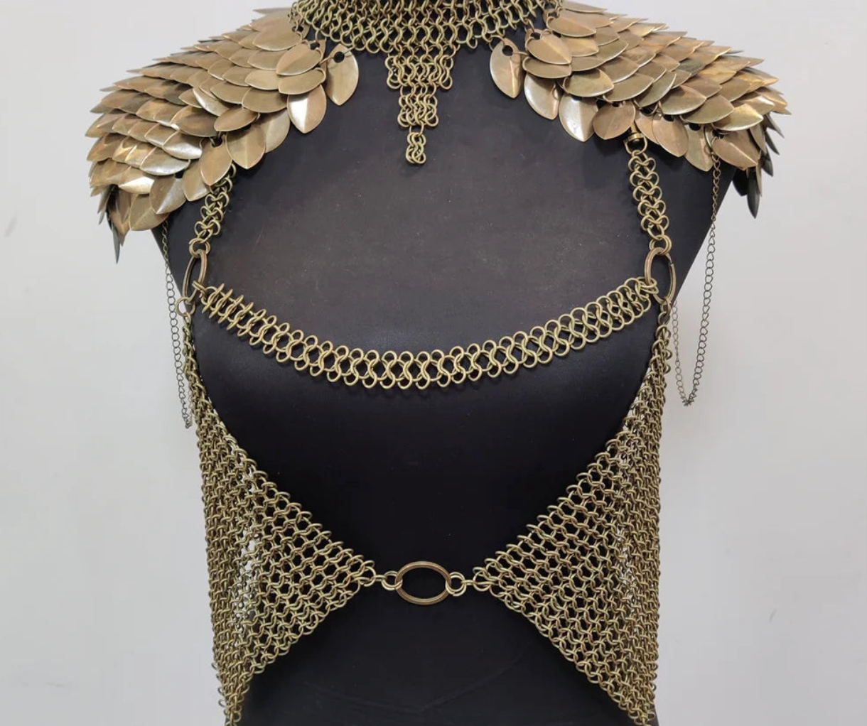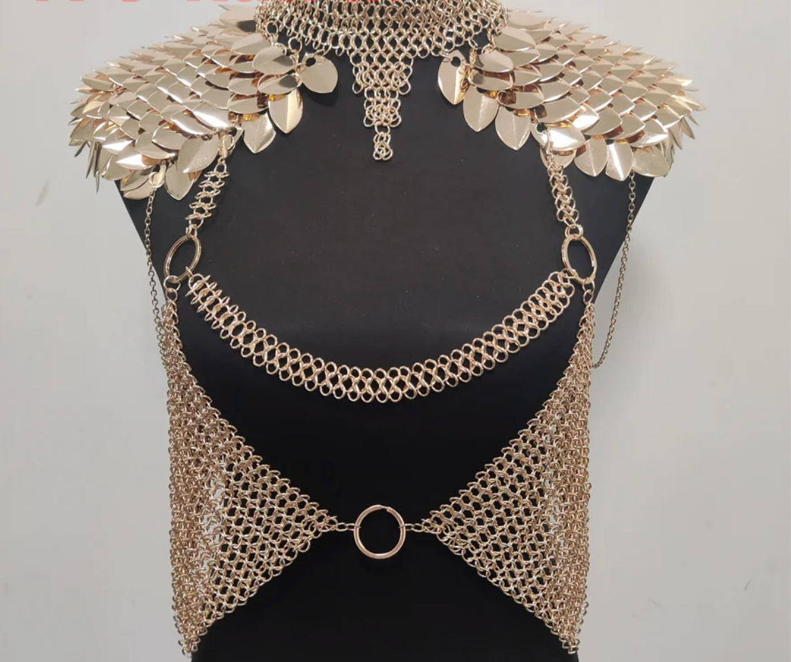 Dragon-inspired body chain armor designed to transform your silhouette into something mythic. As shown in your photos, this statement piece features layered metal scale shoulder plates, a structured choker collar, and cascading chain mesh that drapes across the chest and torso.