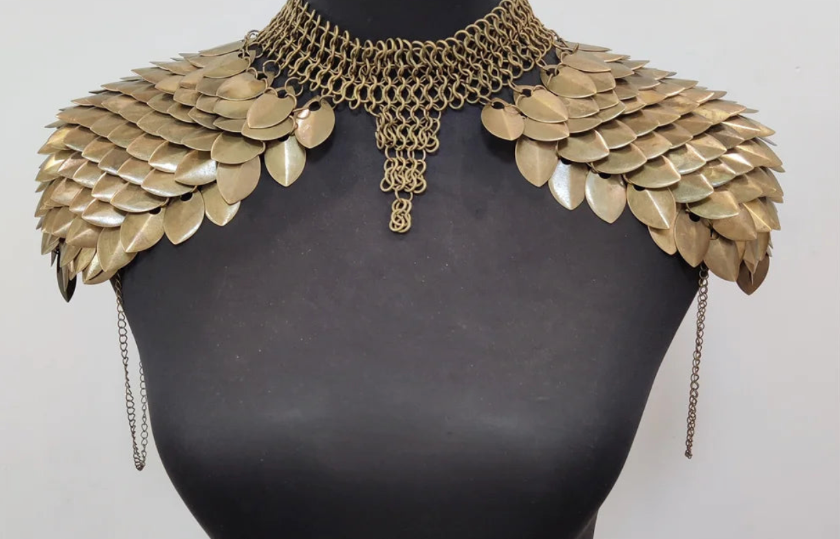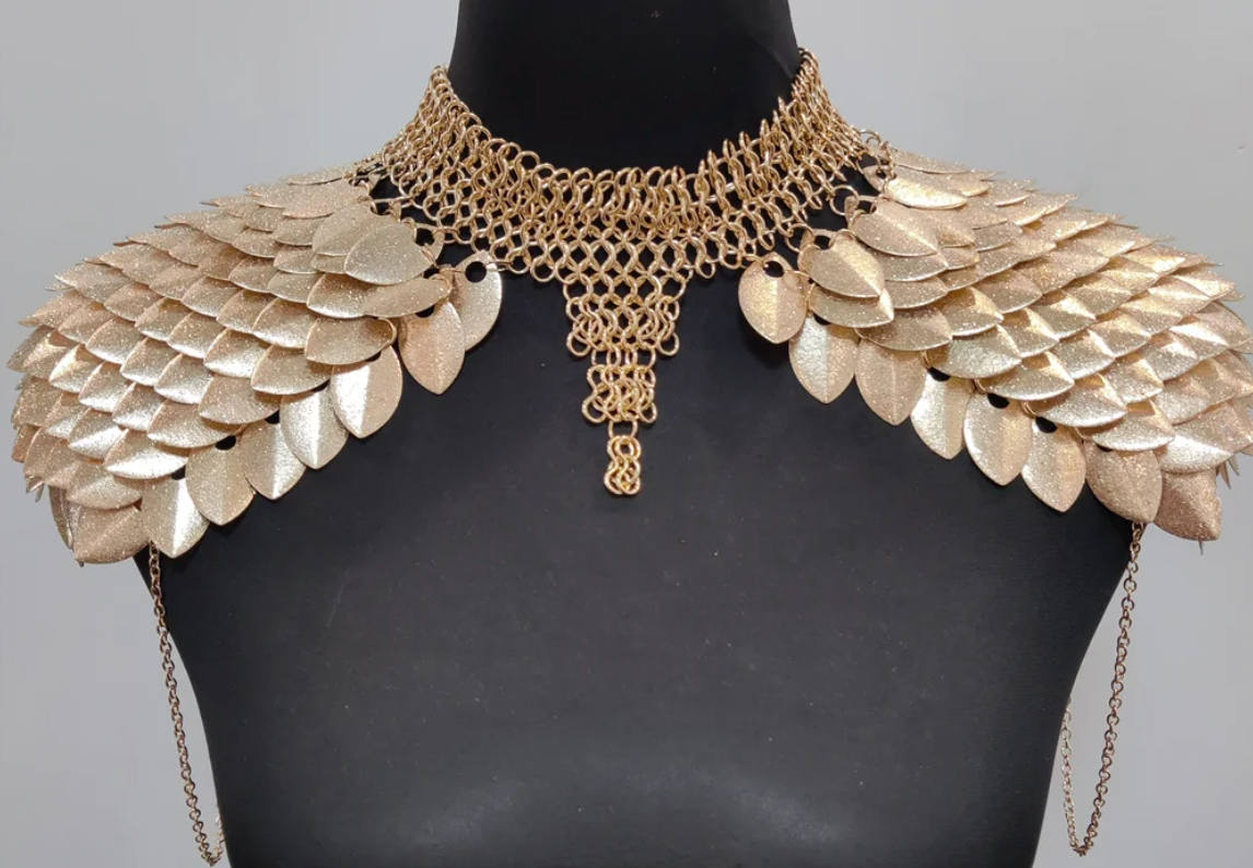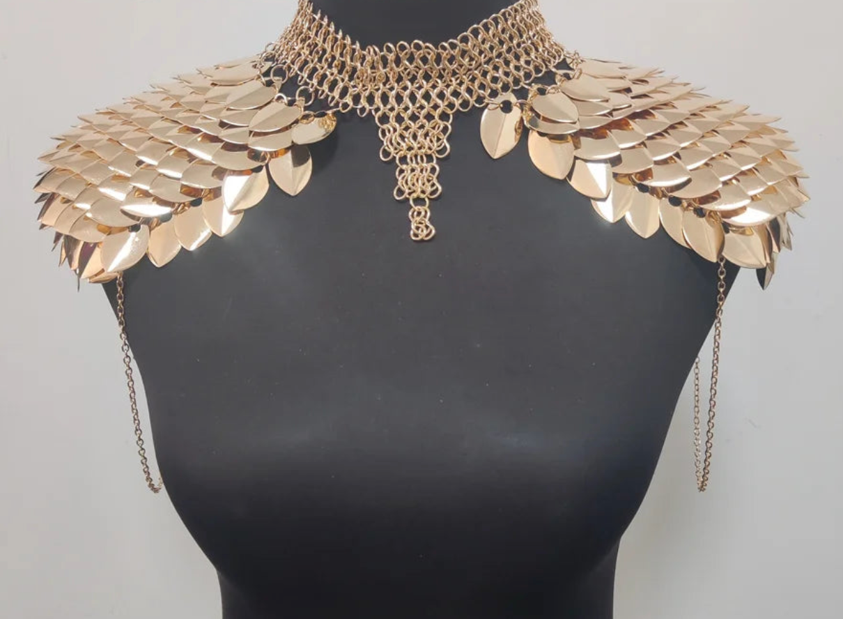 Scale armor has long symbolized strength and invincibility. The dragon archetype represents fire, dominance, and fierce sovereignty. Worn across the shoulders and chest, this piece channels warrior royalty — protective yet seductive, commanding yet fluid 😌🔥.