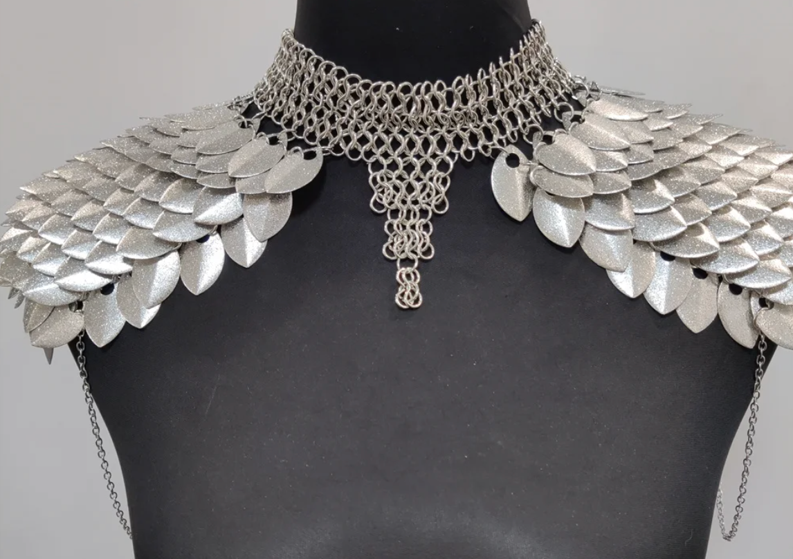 Layered Metal Scale Shoulders with Structured Chain Mesh 🛡️✨