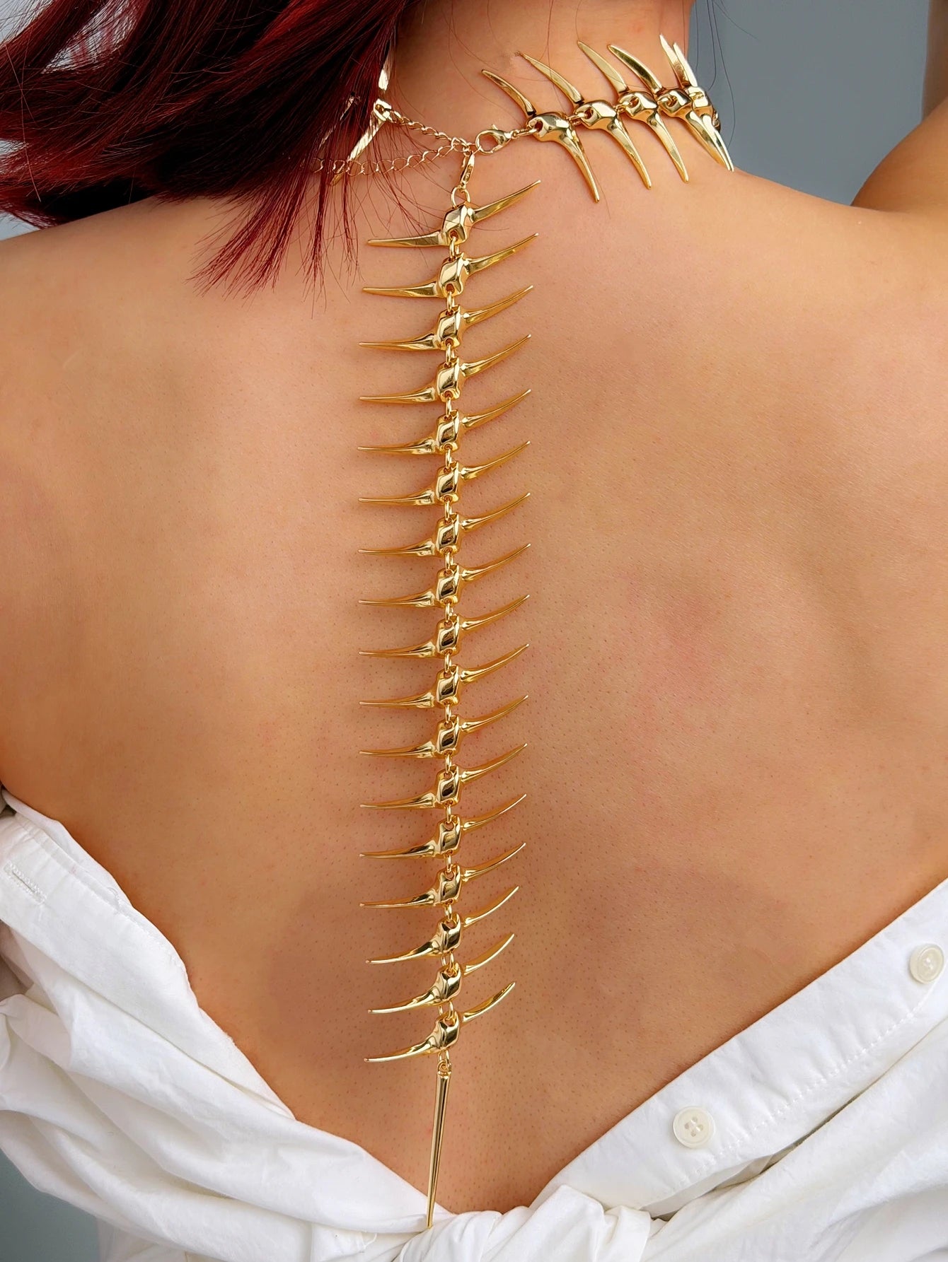 This spine bone back necklace is wearable art that traces the natural line of your back like metallic vertebrae. Designed to drape from the neck down the spine, it creates a striking skeletal illusion that’s bold, sculptural, and unforgettable. Perfect for open-back outfits, editorial looks, and alternative fashion, this piece transforms the body into a canvas.