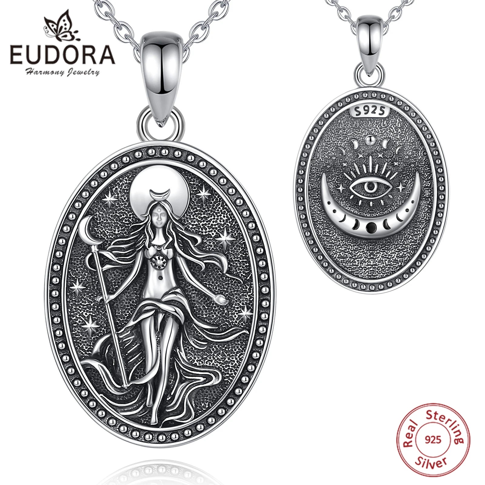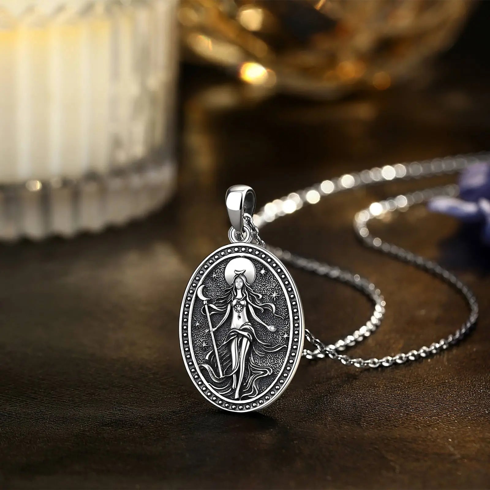 The Nyx Moon Goddess sterling silver pendant necklace is a wearable invocation of night, intuition, and feminine power. Crafted in detailed 925 sterling silver, this oval medallion features the Moon Goddess standing beneath celestial symbols—watchful, calm, and radiant. It’s designed for those drawn to mystery, depth, and symbolic adornment that feels ancient yet timeless.