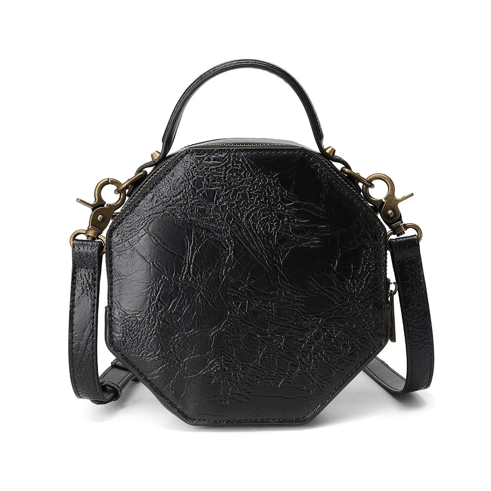 Its rounded-octagonal silhouette sets it apart from traditional handbags while remaining practical.