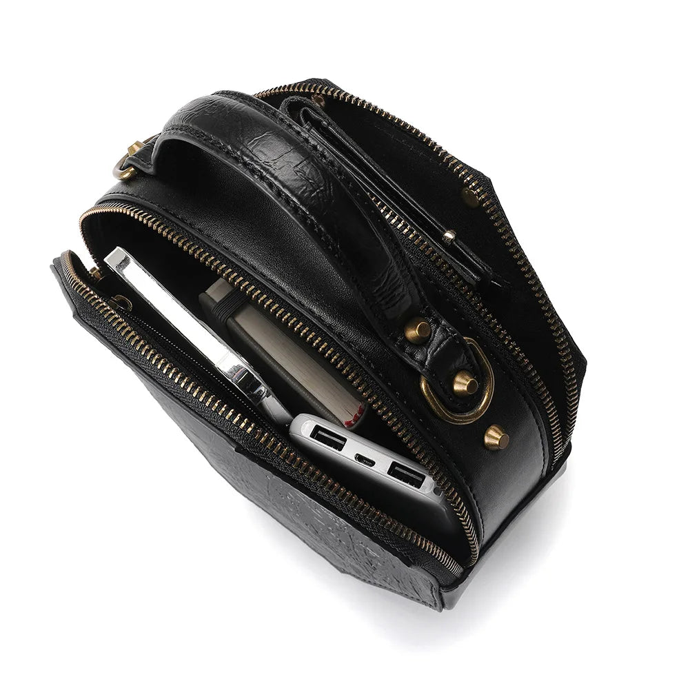 The Steampunk Clock Crossbody Bag is a sculptural handbag designed for those who dress with intention and narrative. Shaped in a distinctive geometric silhouette and detailed with a working-clock-inspired gear face, this bag blends vintage steampunk aesthetics with modern functionality. Crafted in textured black leather with antique brass accents, it functions as both a wearable art object and an everyday crossbody purse.