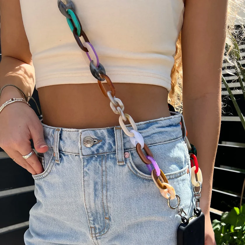 This acrylic phone chain strap turns your phone into a wearable accessory. Clip it on and go—across your body, on your shoulder, or hanging at your side like a mini statement piece.