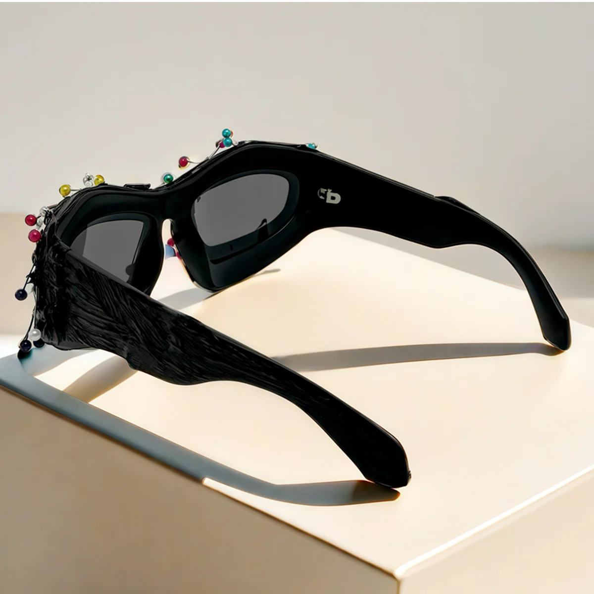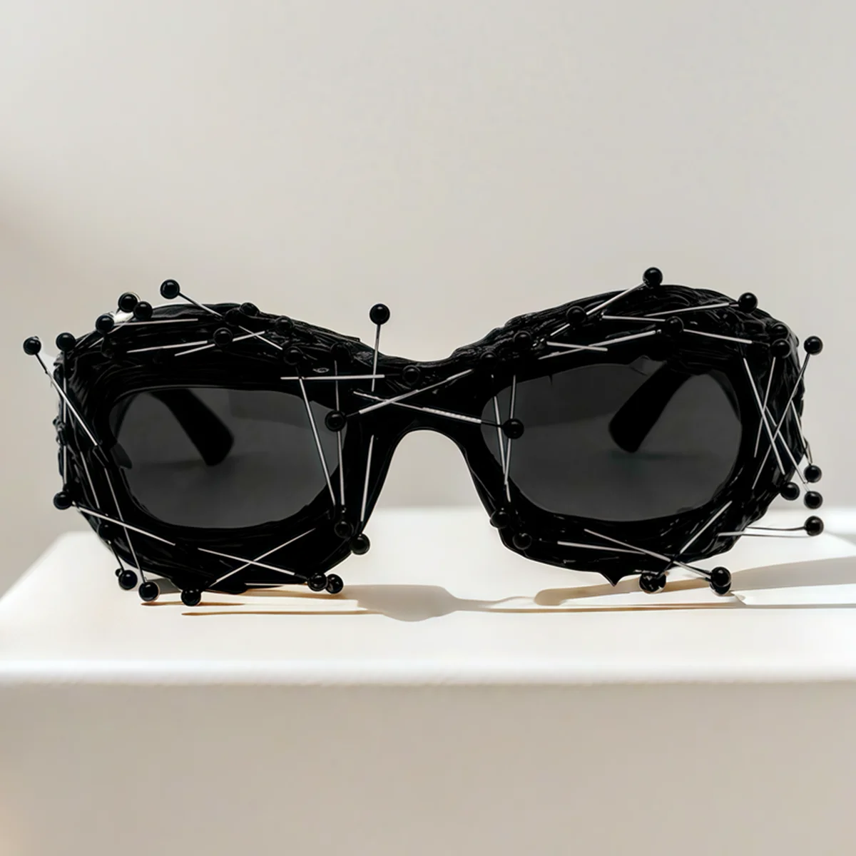 Retro Couture Pin-Stud Cat Eye Sunglasses are a bold fusion of Y2K attitude, underground fashion, and DIY couture aesthetics. Featuring sharp cat-eye frames wrapped in textured fabric and covered in decorative sewing pin–style studs, these sunglasses look like they stepped straight out of a fashion studio mid-creation.