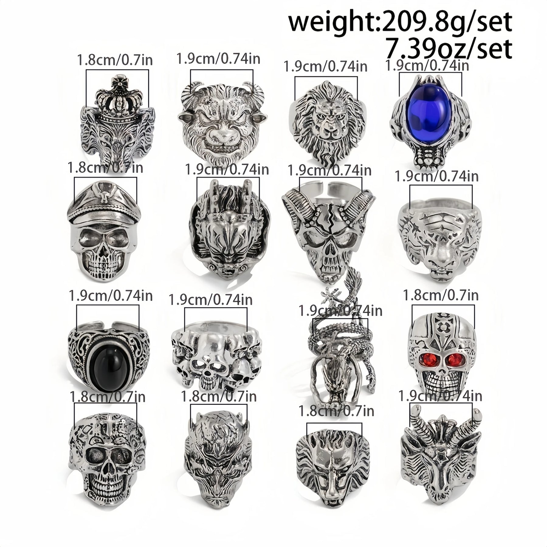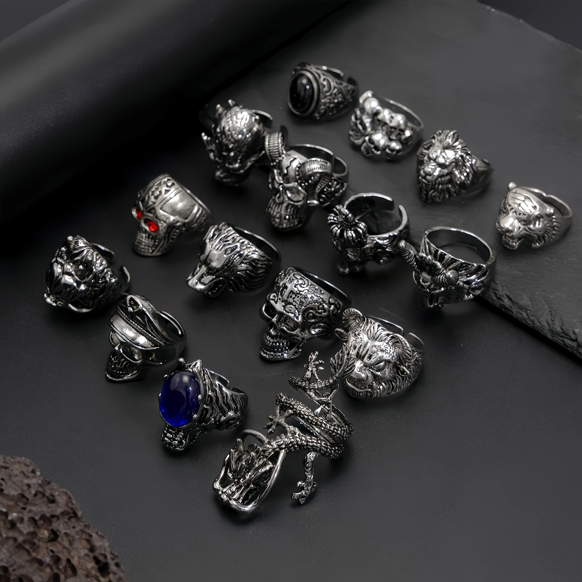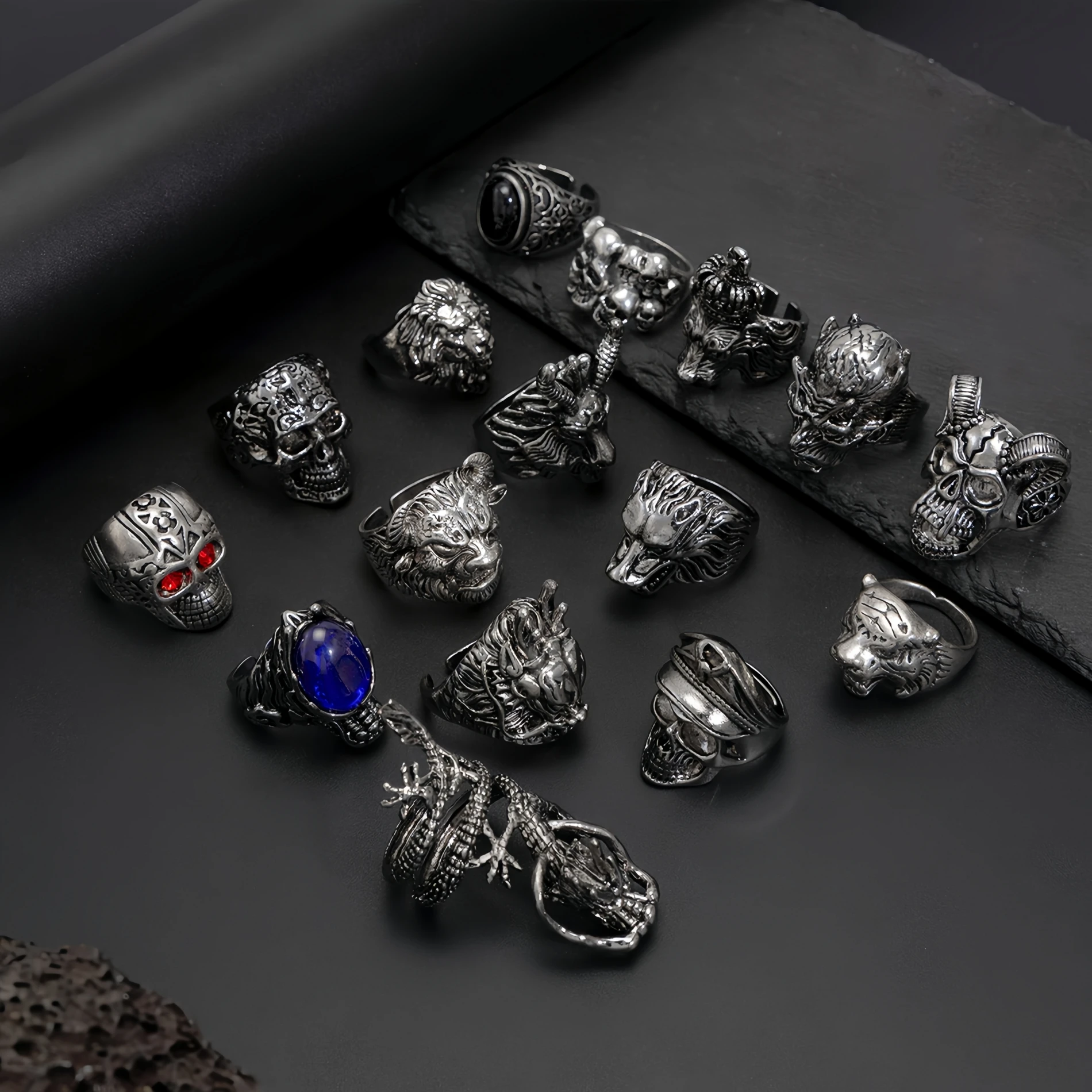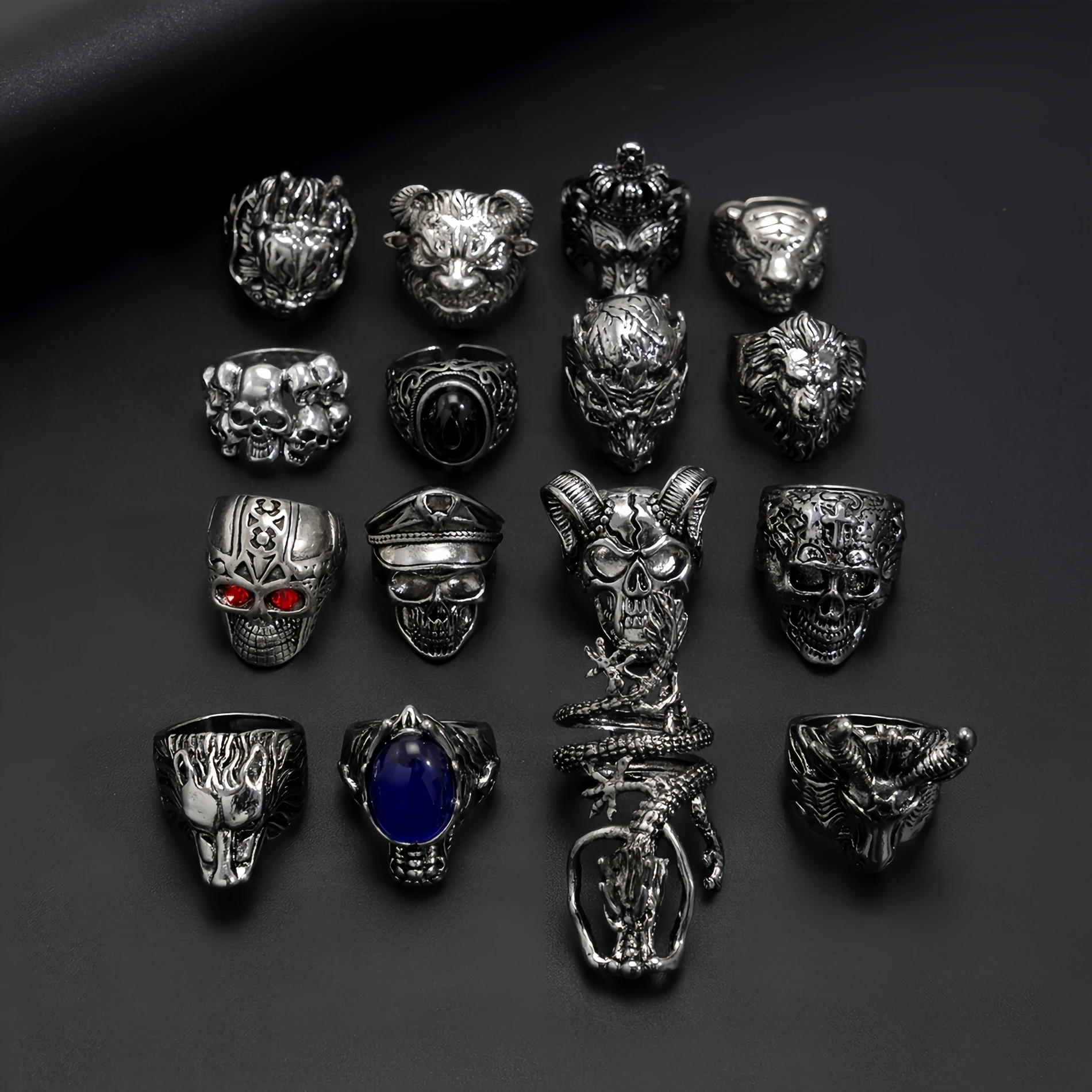 Some rings include dark gemstone or crystal eyes