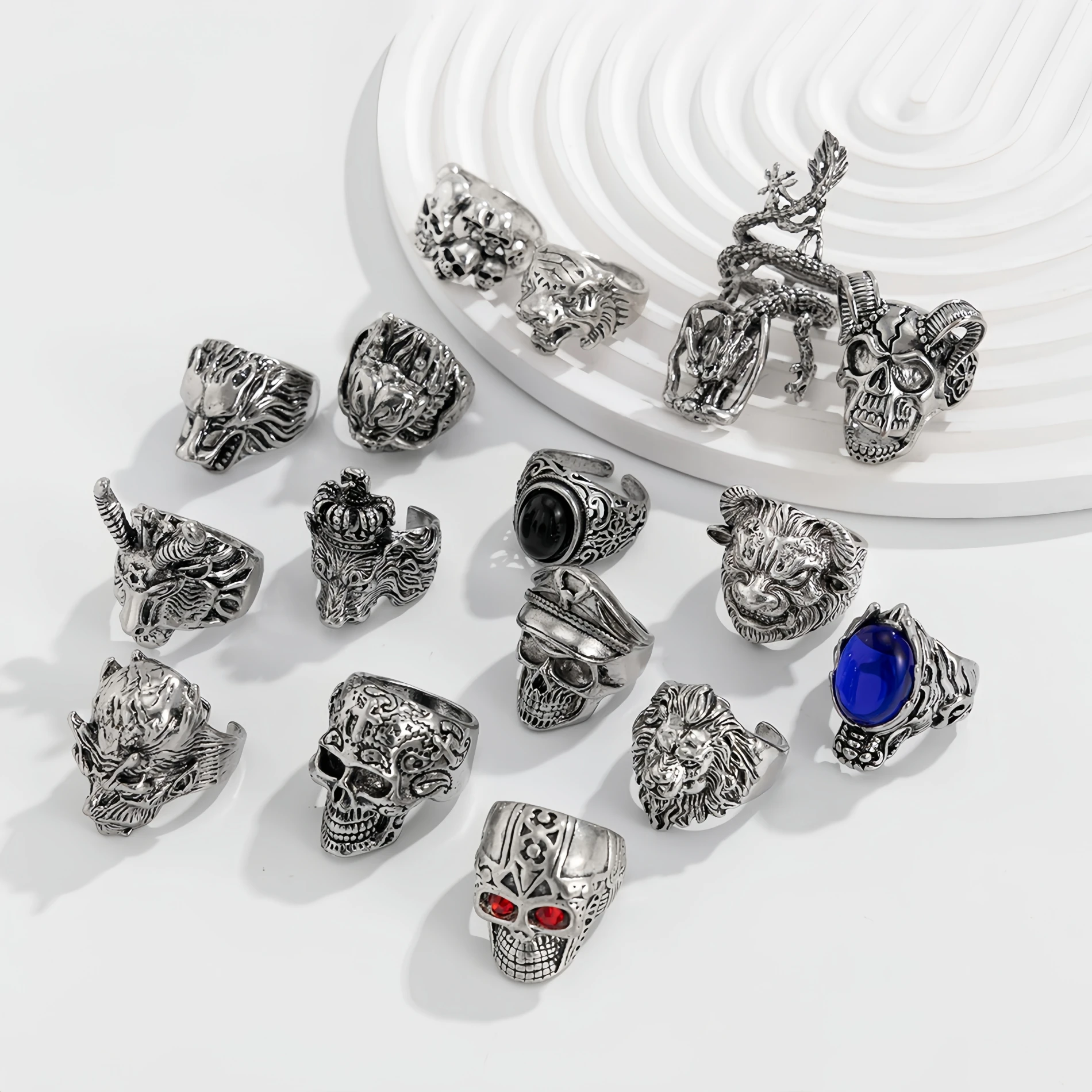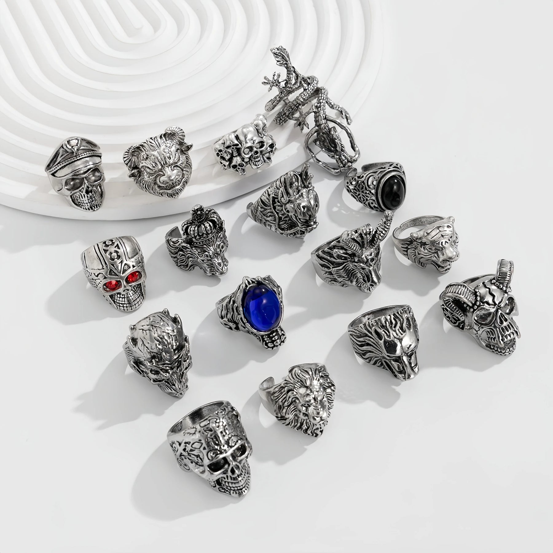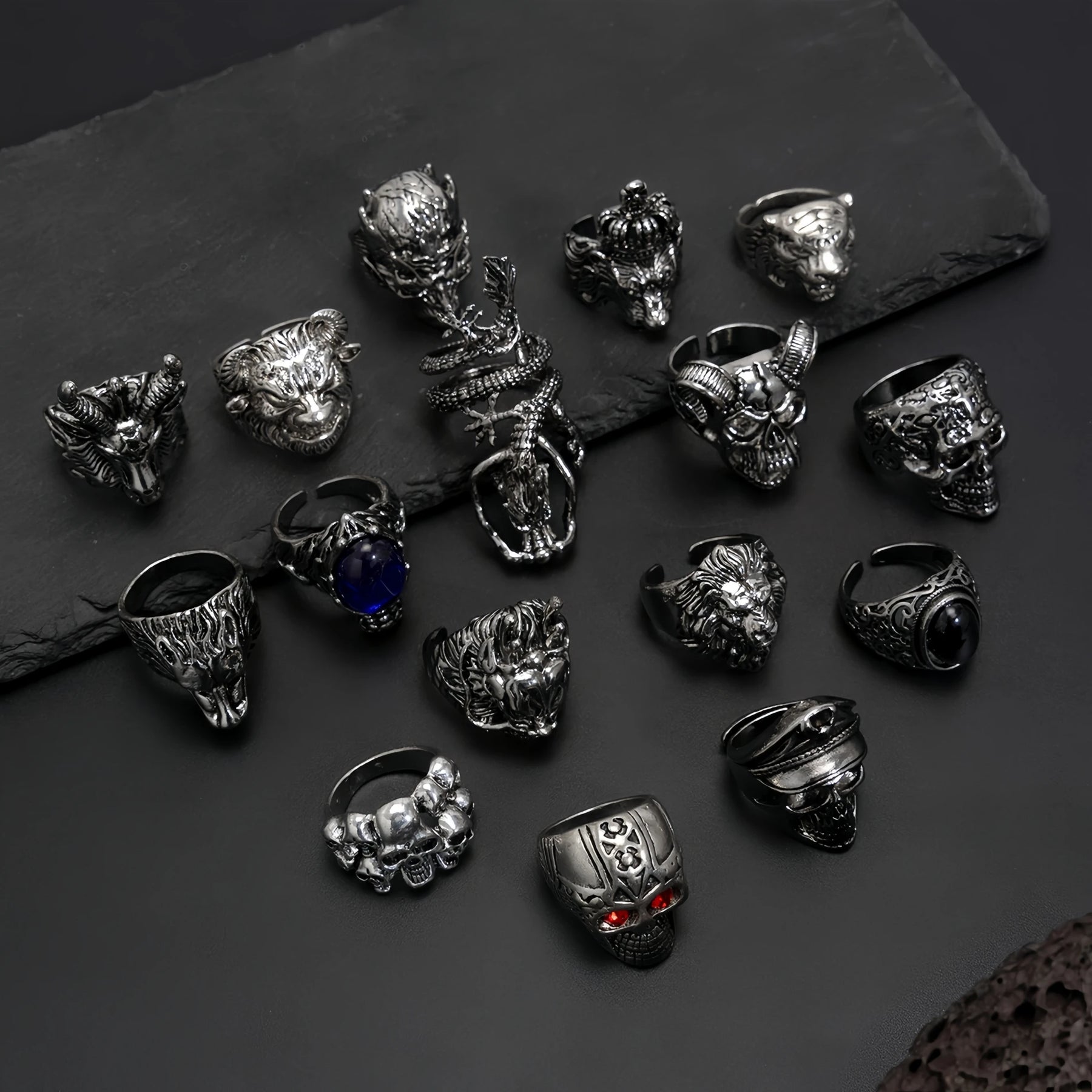 Crafted in solid silver-tone alloy, each ring features sculpted skull designs with deep grooves, oxidized shadows, and striking gemstone accents in select pieces.