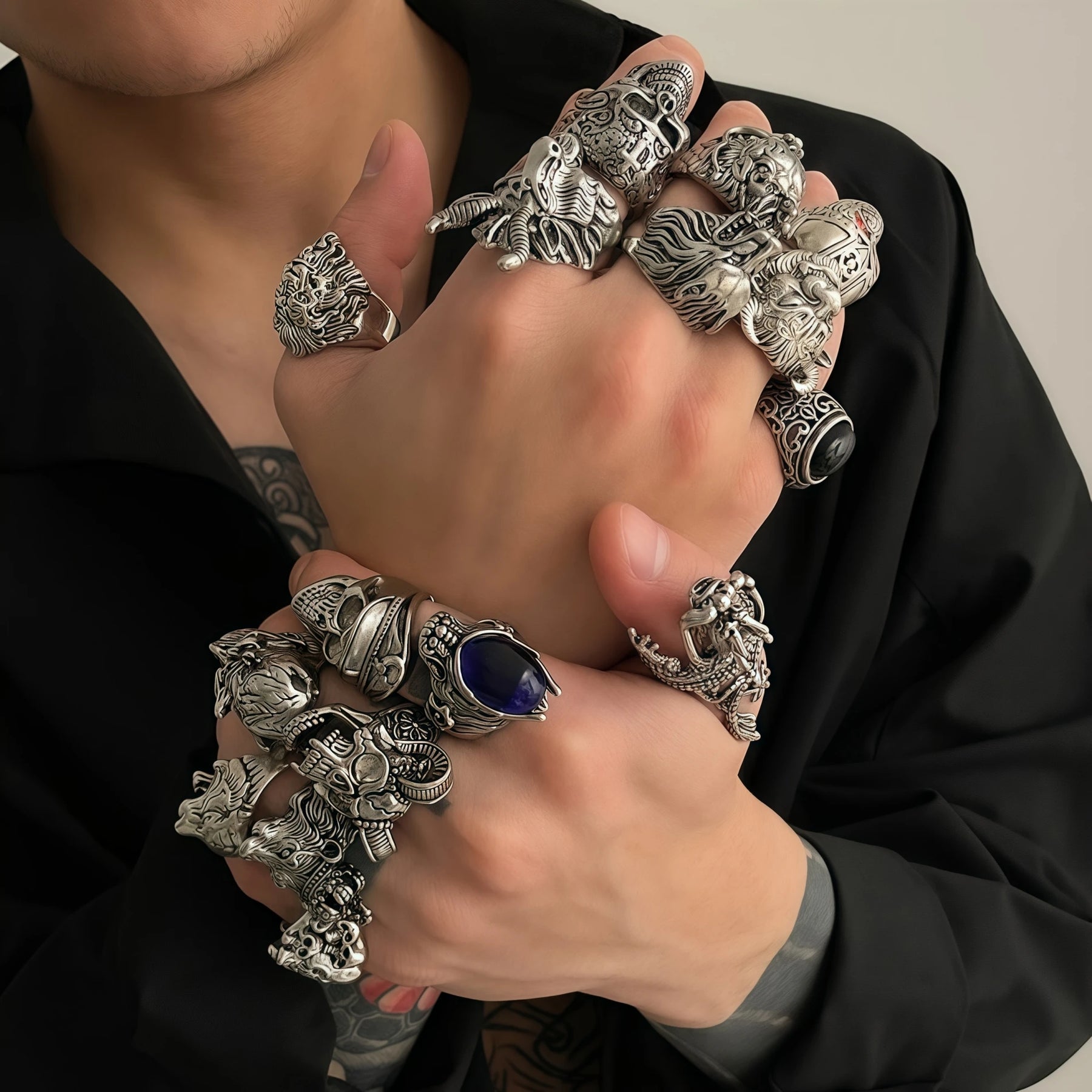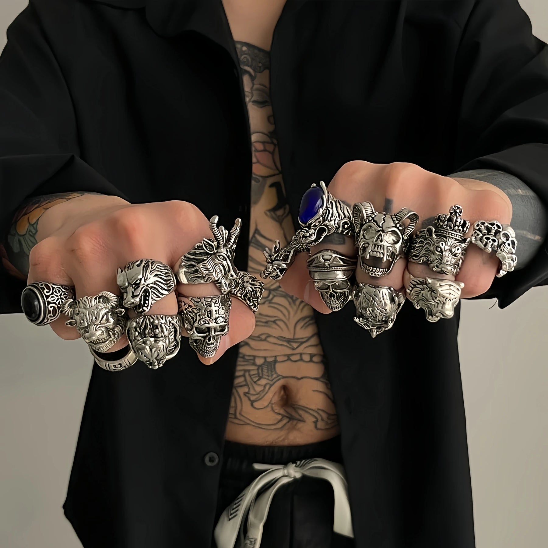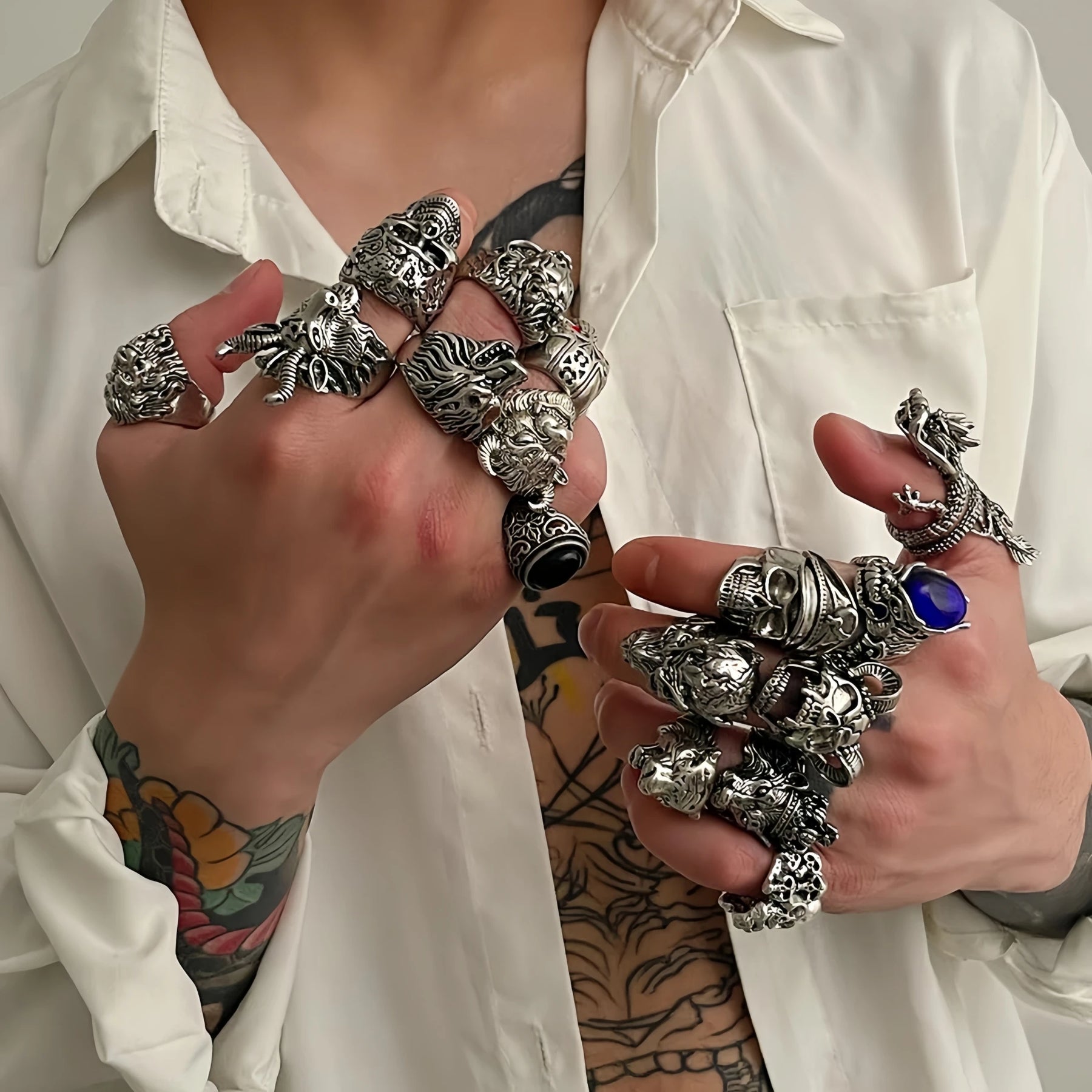These rings are intentionally bold, oversized, and expressive, designed to dominate the hand whether worn individually or stacked across multiple fingers.